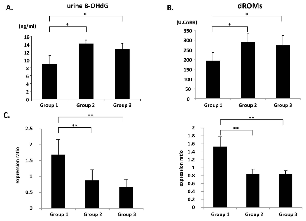 Urine 8-OHdG levels were determined using an ELISA kit (NIKKEN SEIL, Shizuoka, Japan). Serum levels of hydroperoxide, a marker for oxidative stress, were evaluated using the d-ROM test (FREE Carpe Diem; Diacron s.r.l., Grosseto, Italy) [].