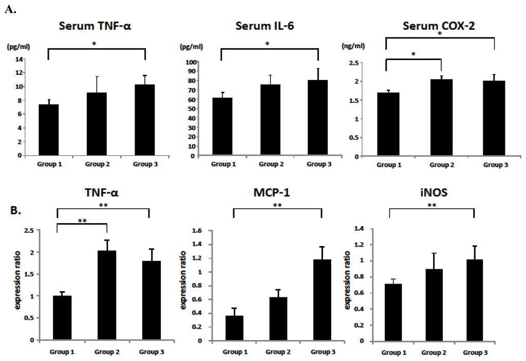 Blood samples from the inferior vena cava were used for chemical analyses. These samples were obtained at the time of euthanasia, prior to which the rats had fasted for 6 h. The serum levels of TNF-α (R&D Systems, Minneapolis, MN, USA), IL-6 (R & D Systems), insulin (Shibayagi, Gunma, Japan), glucose (BioVision Research Products, Mountain View, CA, USA), leptin (Shibayagi), triglyceride (Wako), NEFA (Wako), AT-II (Phoenix Pharmaceuticals, INC, Burlingame, CA, USA), and COX-2 (MyBioSource, San Diego, CA, USA) were determined using an enzyme-linked immunosorbent assay (ELISA) kit according to the manufacturer instructions.