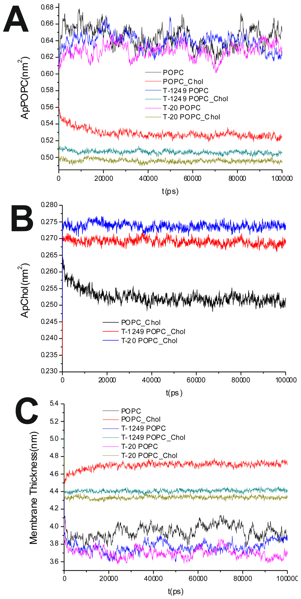 Table 1). This suggests that peptide adsorption would have a condensation-like effect on the bilayers, but also that Chol molecules in the POPC/Chol bilayers are more exposed to solvent molecules in membranes interacting with either T-20 or T-1249. Peptide adsorption has little or no effect in the membrane thickness (