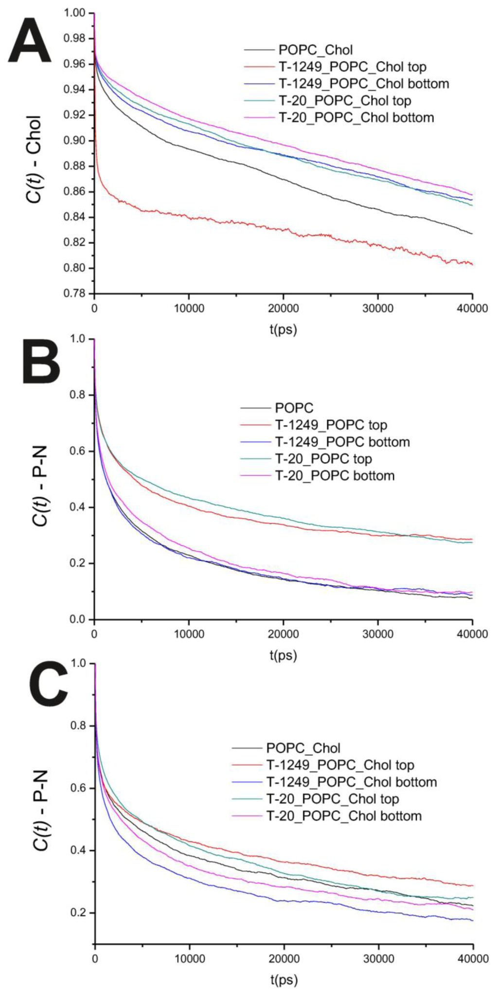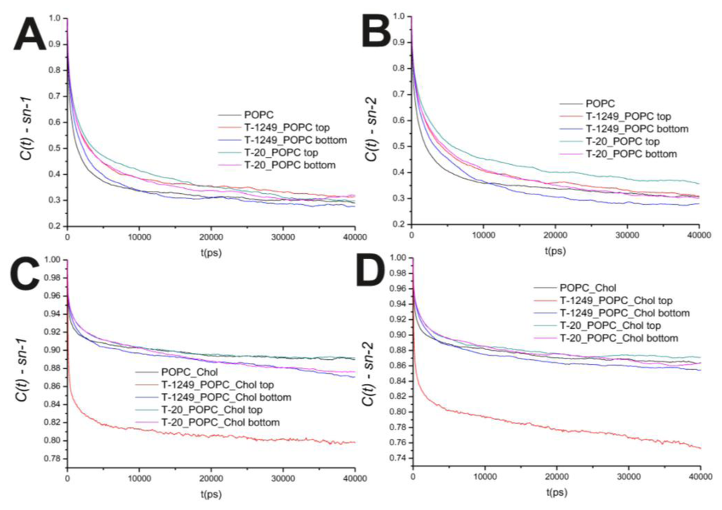 Figure 3A). Chol shows a faster dynamics in the top leaflet of the T-1249/POPC/Chol system, and this appears to be a similar phenomenon, as in the acyl chain axis. Since Chol interacts strongly with T-1249, namely via H bonds [