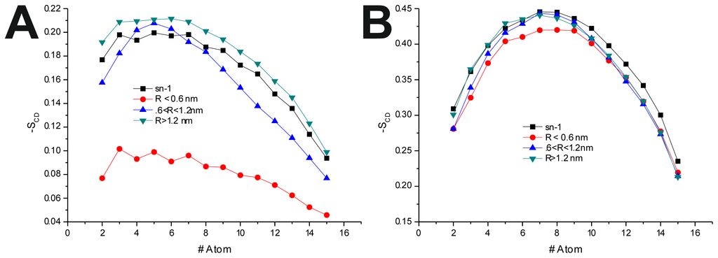 ab is the Kronecker delta (< > denotes both ensemble and time averaging). In our simulations, using a united atom force field, the order parameter for saturated and unsaturated carbons, −
