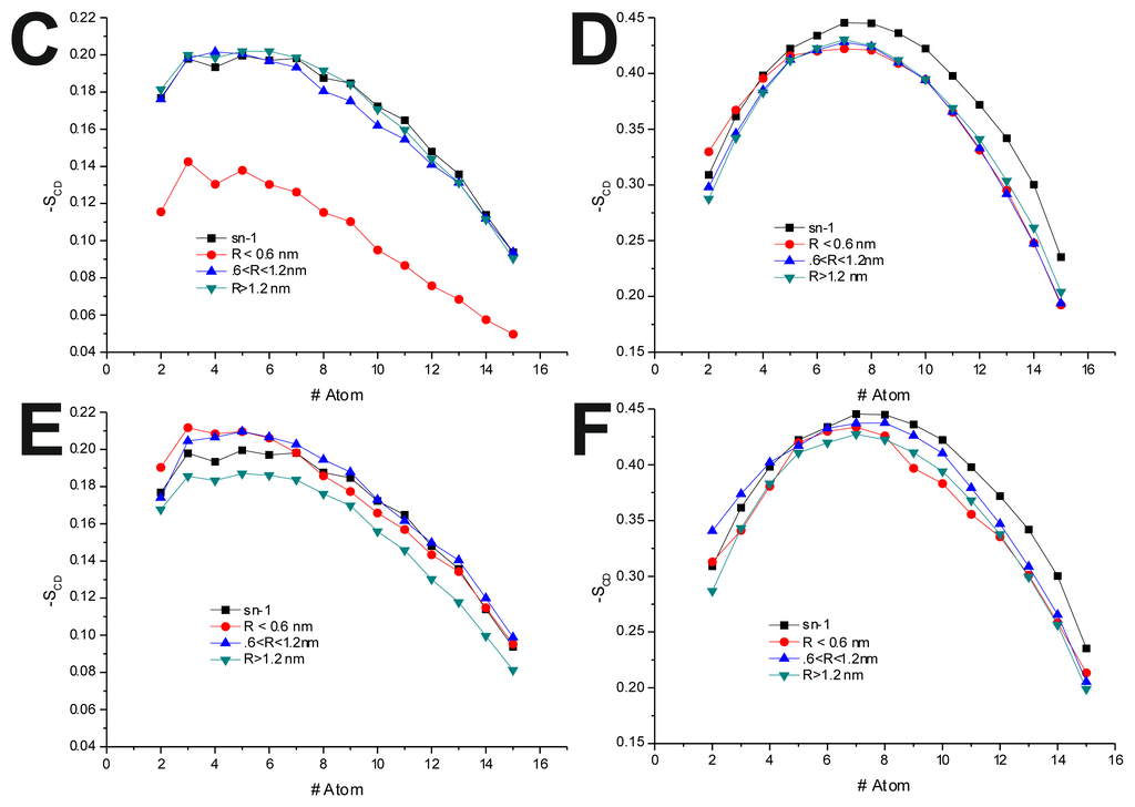 Figure 1A,B). This was also verified by observation of the membrane thickness parameter. Membrane thickness was determined by the ensemble average of the P–P distance between phosphate P atoms of opposite leaflets.