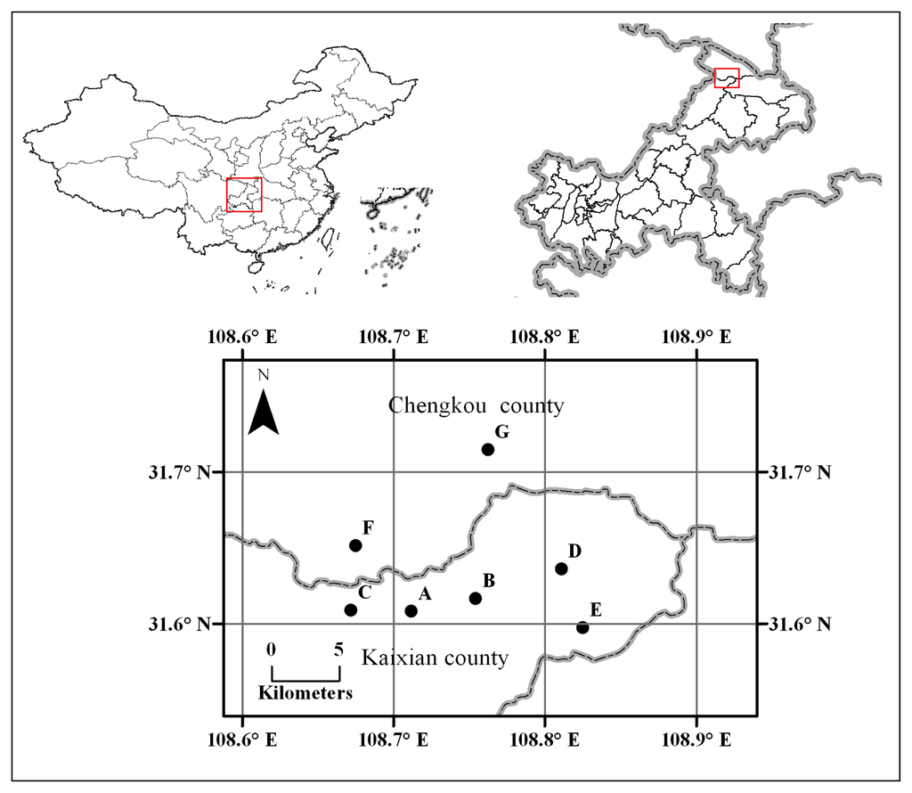 T. sutchuenensis were found only on bare limestone faces on ridges or steep mountains at North-East Chongqing, China, with different population size. According to the field survey information, seven wild populations of T. sutchuenensis with a total of 139 individuals were sampled throughout its distribution range (Table 1; Figure 1). For large populations (n > 100), 30 adult individuals were selected with distance of >10 m; while for small populations (n < 30), all available adult individuals were sampled. For each sampled individual, fresh leaves (~10 g) were collected and dried in silica gel and stored at −20 °C until subsequent DNA extraction.