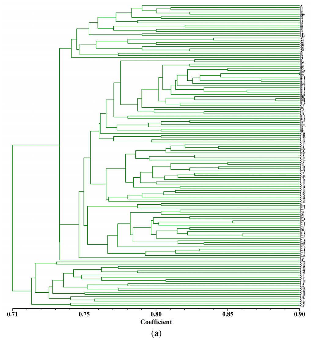 - Peakall, R.; Smouse, P.E. GenAlEx 6.5: Genetic analysis in excel. Population genetic software for teaching and research—An update. Bioinformatics 2012, 28, 2537–2539. [Google Scholar]