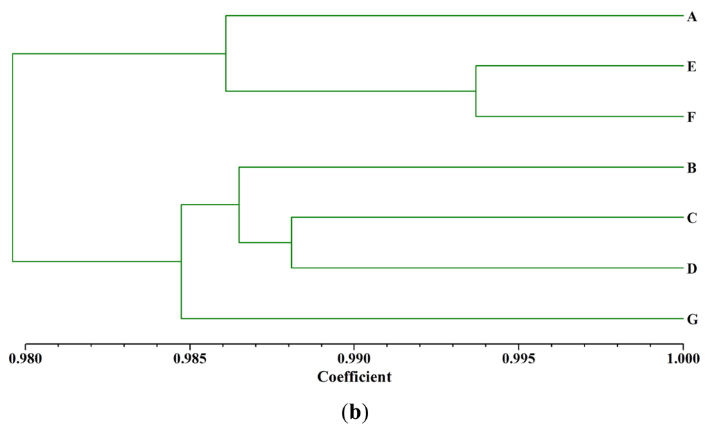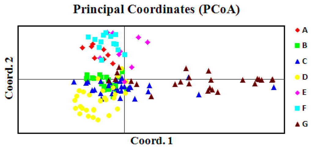 Principal coordinate analysis (PCoA) was performed to provide spatial representation of the relative genetic distances among individuals and to determine the consistency of differentiation among populations defined by the cluster analysis. The first two principal components explained 26.17% and 20.09% of total variation, respectively, and the 63.52% was explained by the first three components (Figure 3). In an agreement with the cluster analysis, individuals from each population formed a separate plot and could be clearly distinguished from those of other populations. The first principal coordinate separated individuals of population A, E and F from the individuals of other four populations. The second principal coordinate separated most individuals of population B, C and D from those of G, which indicated less population-specific identity for population G.