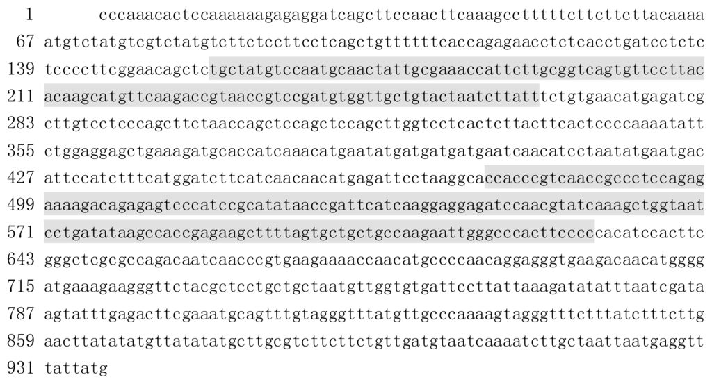Using homologous cloning, the gene sequence of 937 bp in length was obtained. The open reading frame (ORF) was 702 bp in length (capital letters in the Figure 1). The shaded area at 157–264 bp in the upstream of the ORF contained a C2C2 zinc finger-like domain; the shaded area at 475–630 bp at the downstream of the ORF was where a YABBY domain was located (Figure 1). The gene was named BraYAB1-702, with GenBank Accession No. JQ828987. The comparison on the National Center for Biotechnology Information (NCBI) website showed a 99% similarity with the DBC43-3-2 gene of Brassica campestris L. ssp. pekinensis (Lour.) Olsson, and an 89% similarity with Arabidopsis thaliana axial regulator YABBY1 (FIL).