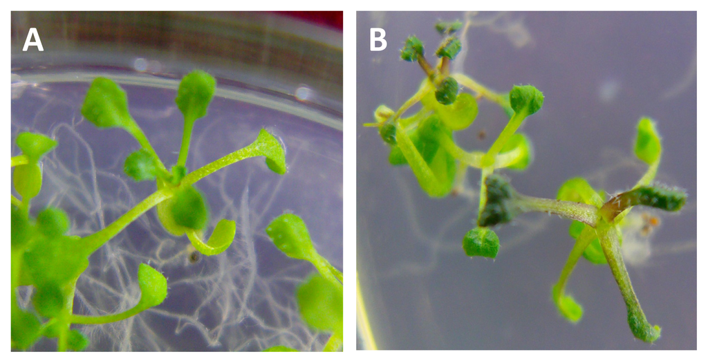 The purple seedlings of BraYAB1-702 gene-modified Arabidopsis thaliana. (A) Wild-type Arabidopsis thaliana; (B) Transgenic Arabidopsis thaliana.