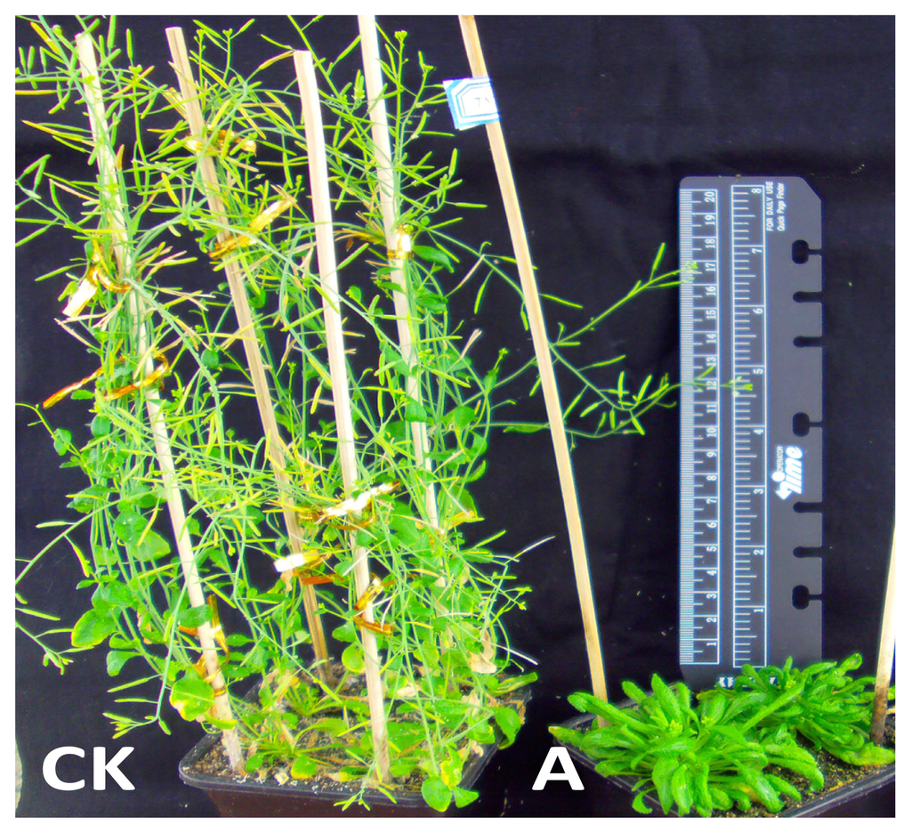 Comparison of wild type (CK) and transgenic (A) Arabidopsis thaliana during flowering stage.