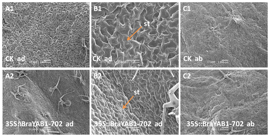 Scanning electron microscopic analysis of leaves of 35S::BraYAB1-702 transgenic Arabidopsis thaliana. (A1) Adaxial epidermis of a wild-type rosette leaf (×100); (B1) Adaxial epidermis of a wild-type rosette leaf (×400); (C1) Abaxial epidermis of a wild-type rosette leaf (×100); (A2) Adaxial epidermis of a transgenic rosette leaf (×100); (B2) Adaxial epidermis of a transgenic rosette leaf (×400); (C2) Abaxial epidermis of a transgenic rosette leaf (×100); ad: Adaxial epidermis of a rosette leaf; ab: Abaxial epidermis of a rosette leaf; St: Stomata. Bars in (A1), (C1), (A2) and (C2) are 100 μm and bars in (B1) and (B2) are 50 μm.