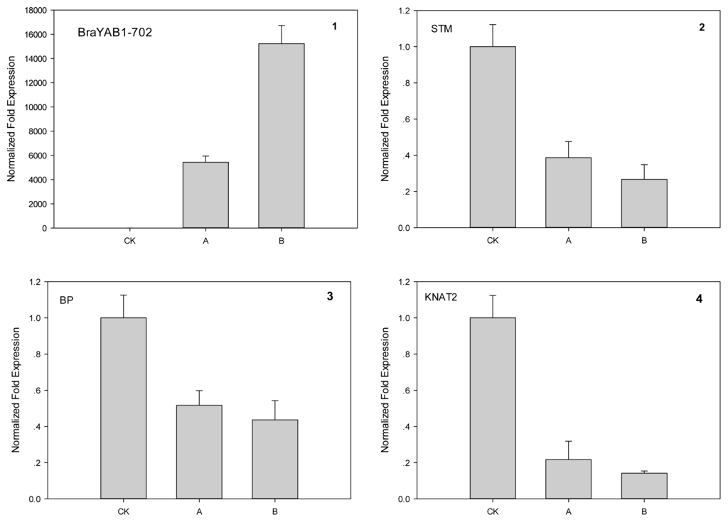 Transcript levels of BraYAB1-702, STM, BP and KNAT2 in wild-type plants and 35S::BraYAB1-702 transgenic plants (1–4). CK: Wild-type seedlings; A: Transgenic seedlings with slightly curled leaves; B: Transgenic seedlings with strongly curled leaves.