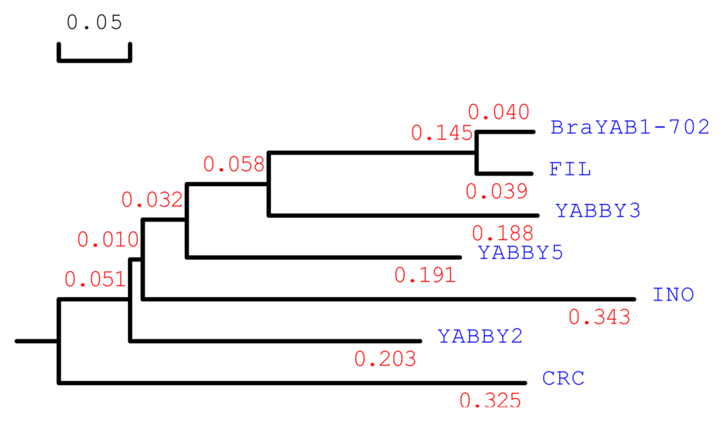 Phylogenetic tree analysis of BraYAB1-702. GenBank accession number of the involved genes for phylogenetic tree analysis are as follows: BraYAB1-702 (JQ828987), FIL (AAD33715), YABBY2 (AAD33716), YABBY3 (AAD33717), INO (AAF23754), YABBY5 (NM179750), CRC (AAD30526). The length of the branch line indicates the extent of difference according to the scale at upper left.