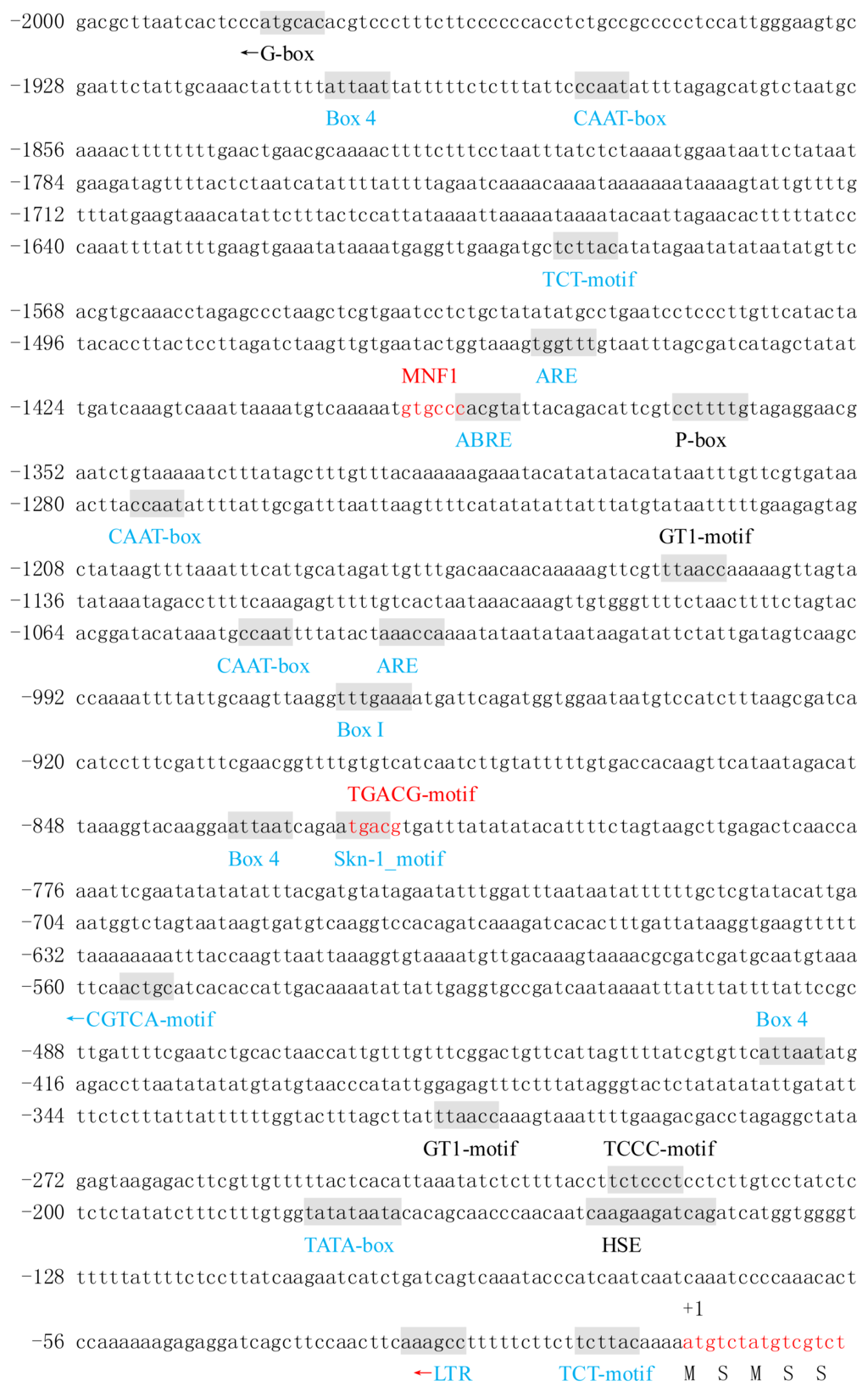 In the light response, two promoters all contain the cis-acting elements Box I, Box 4 and TCT-motif, but the number of these cis elements is different. The promoter of BraYAB1-702 gene has three Box4s and two TCT-motifs, but the promoter of FIL gene has four Box4s and one TCT-motif. In addition, the promoter of the BraYAB1-702 gene also has its own unique cis-acting elements—two GT1-motifs, one MNF1, one TCCC-motif and one G-box—that its action direction is opposite compared with its promoter sequence. The promoter of FIL gene has its own unique cis-acting element MRE.