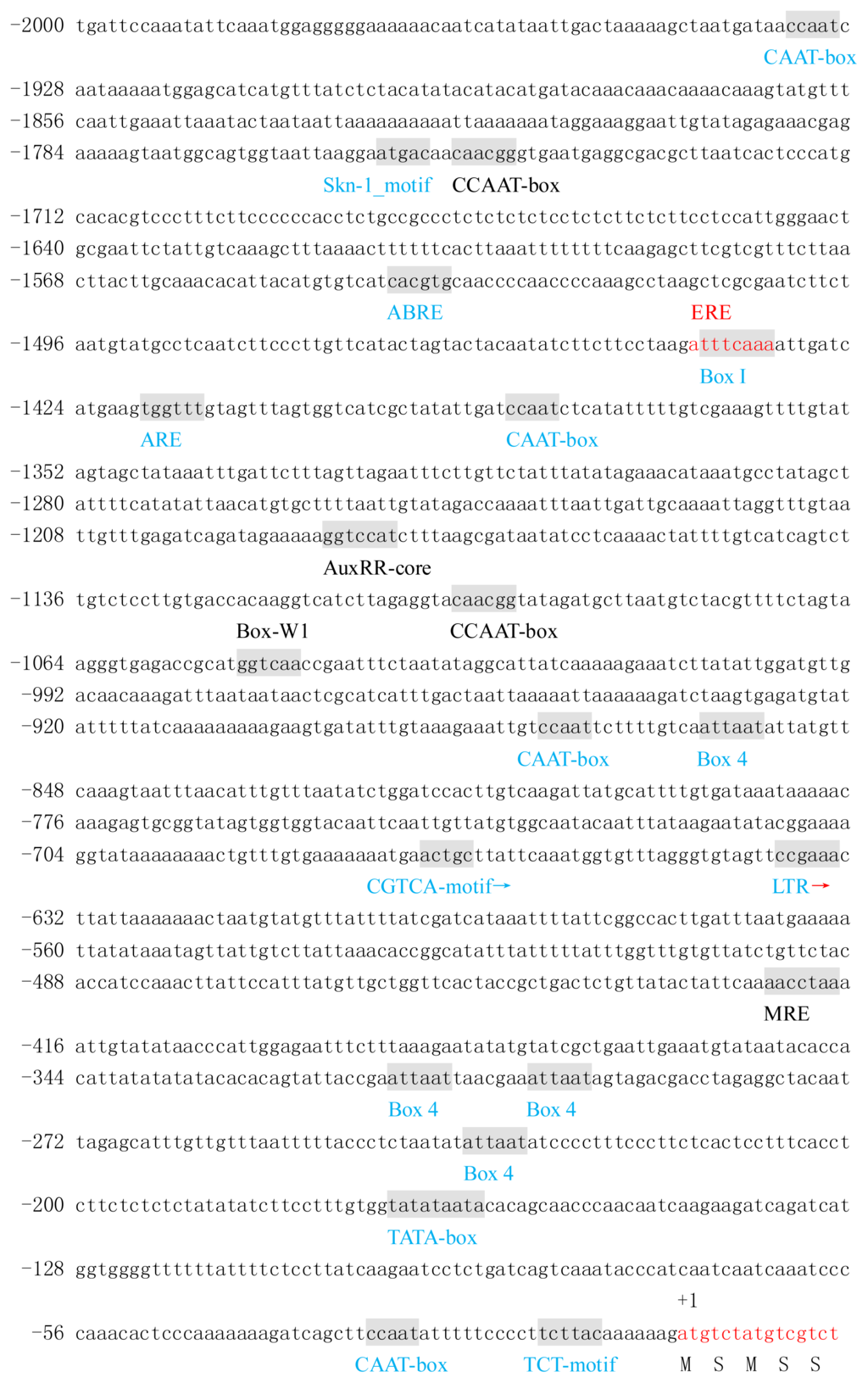 The two promoters both have ARE, a cis-regulatory element essential for the anaerobic induction, and Skn-1_motif, a cis-regulatory element for the endosperm expression. In addition, the promoter of FIL gene from Arabidpsis alone has Box-W1, a cis-regulatory element related to fungal elicitor responsiveness, and CCAAT-box, a cis-acting element combined with the transcription factor MYBHv1.