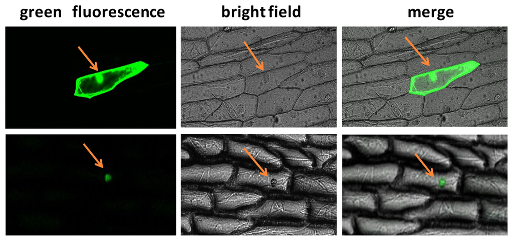 The 35S::BraYAB1-702-GFP2 fusion expression vector was constructed. The epidermal cells of onion were subjected to ballistic bombardment. After dark culture for 24 h in MS culture medium, confocal laser scanning microscopy was used for photography, and the photos were analysed by NIS Viewer 4.00 b770 (Nikon, Japan). Ballistic PDS-1000/He particle delivery system (Bio-rad, Hercules, CA, USA) and Confocal microscope A1R (Nikon, Japan) were used respectively. Reference Rey et al.’s method [], we have analysed the nuclear localization signal (NLS) on the BraYAB1-702 protein sequence by using the software WoLFPSORT (Human Genome Center, Institute for Medical Science, University of Tokyo, Tokyo, Japan).