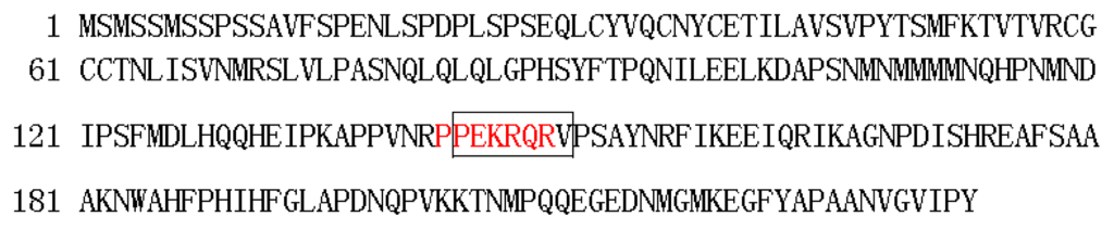 The results of the subcellular localization analysis showed that the green fluorescence was only observed in the nuclei of the onion epidermal cells transformed by the fusion expression vector 35S::BraYAB1-702-GFP. In the negative control group, the whole epidermal cells of onion transformed by 35S::GFP2 showed green fluorescence (Figure 5). This experiment showed that the product expressed by BraYAB1-702 gene was a transcription factor located in the nucleus. Analysis of subcellular localization showed that the gene was located in the nucleus, which was consistent with the localization result of FIL genes of Arabidopsis thaliana [] and OsYAB1 gene of Oryza stative L. []. Analysis of the nuclear localization signal in BraYAB1-702 protein sequence (NLS) found that there is a putative nuclear localization signal sequence PPEKRQR at the region from amino acid 142 to 148 (red letters in Figure 6), or a putative nuclear localization signal sequence PEKRQRV at the region from amino acid 143 to 149 (letters in box in Figure 6).