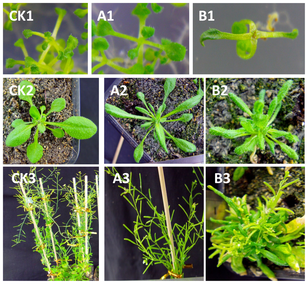 The method described in Section 4.2 was employed to extract total RNA and first strand CDNA synthesis for wild type and transgenic Arabidopsis thaliana plants. The primers of BraYAB1-702 and reference gene UBC (Ubiquitin conjugating enzyme) were designed to conduct quantitative analysis of transgenic Arabidopsis thaliana plants. To study the molecular mechanism of inhibition of the growth of SAM in transgenic Arabidopsis thaliana plants, the primers for STM, BP and KNAT2 genes related to the development of SAM of Arabidopsis thaliana and ACTIN8 was used as the reference gene (Table 1) were designed for quantitative analysis. The primers of STM, BP, KNAT2 and ACTIN8 were designed following the method described by Kumaran et al. []. The data obtained by real-time PCR were processed using SigmaPlot10.0 (Systat Software Inc., San Jose, CA, USA).