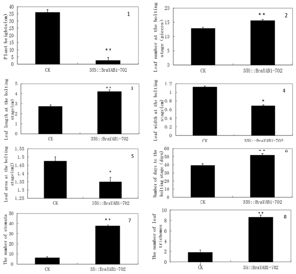Variance analyses for phenotype of wild type and transgenic Arabidopsis. 1: Plant heights; 2: Leaf number of the rosette leaf at the bolting stage; 3: Leaf length of the rosette leaf at the bolting stage; 4: Leaf width of the rosette leaf at the bolting stage; 5: Leaf area of the rosette leaf at the bolting stage; 6: The number of days to the bolting stage; 7: The number of stomata; 8: The number of leaf trichomes; CK: Wild type; 35S::BraYAB1-702: Transgenic Arabidopsis with BraYAB1-702 gene; * The difference was significant as compared to wild type (p < 0.05); ** The difference was extremely significant as compared to wild type (p < 0.01).