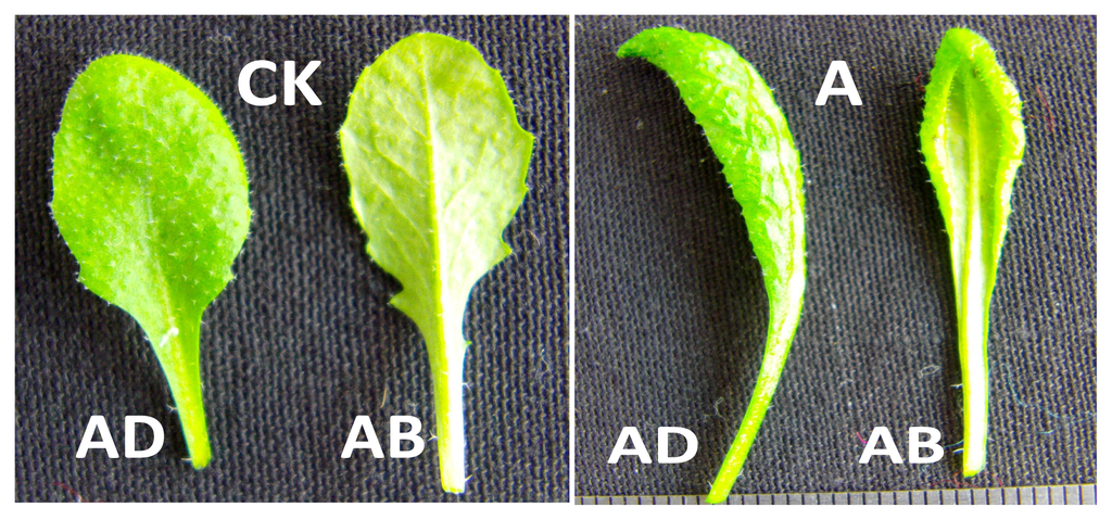 Comparison of the adaxial and abaxial sides of the leaves of wild type and 35S::BraYAB1-702 transgenic Arabidopsis thaliana. CK: Leaves of wild type; (A) Leaves of transgenic Arabidopsis thaliana; (AD) Adaxial side of leaf; (AB) Abaxial side of leaf.