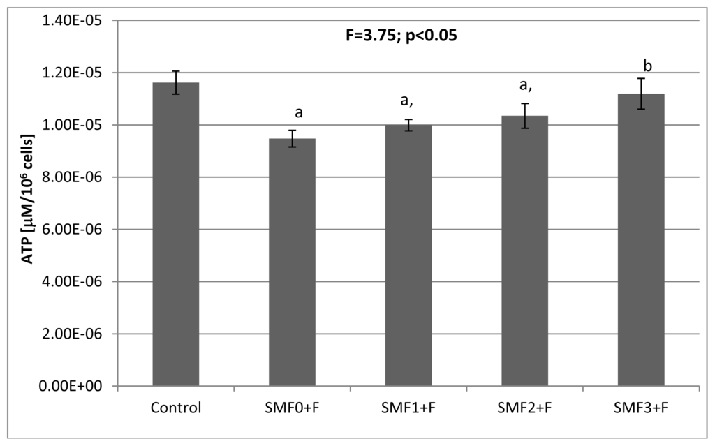 The presence of a static magnetic field also modified the energy state of the fibroblasts. Exposure to fluoride and a constant magnetic field caused changes in the cellular ATP concentration (Figure 1). In the SMF1 + F and SMF2 + F cultures, the ATP concentration was significantly (p < 0.05) lower than in that in the control group, whereas the ATP concentration in the SMF3 + F culture did not differ from that in the control group. Comparison of the results obtained for SMF0 + F indicates a substantial increase in the ATP concentration in cultures subjected to a static magnetic field. An increase in the ATP concentration in Escherichia coli and Pseudomonas putida bacteria subjected to a 17 mT SMF was previously reported by Filipič et al. [24].