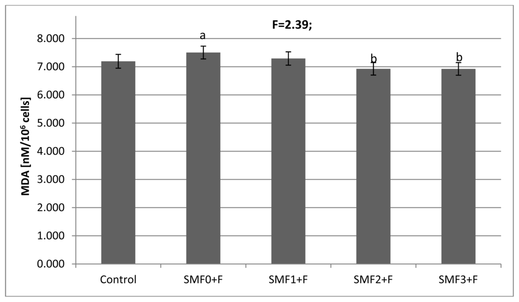 Evaluation of lipid peroxidation in our fibroblast cultures showed that SMF exposure positively affected the MDA concentration, causing its decrease compared to the cultures subjected to fluoride ion-induced oxidizing stress. In the SMF2 + F and SMF3 + F cultures, the MDA concentration was ≈8% lower than that determined for SMF0 + F (Figure 2). Our data point to the existence an adaptive mechanism that is associated with a decrease in MDA, following exposure to a SMF. In contrast, Kabuto et al. [25] showed that exposure to a SMF of 1.5–300 mT has no effect on the accumulation of MDA in brain homogenates. In addition, HL-60 cells and lymphocytes exposed to a 7 mT SMF did not exhibit increased lipid peroxidation or increased MDA levels [26,27].