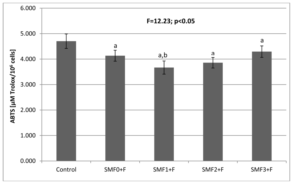 Effects of the static magnetic fields (SMF) and fluoride on antioxidant status (ABTS) in fibroblasts. Results are presented as mean ± S.D. (n = 5); ap < 0.05 vs. Control; bp < 0.05 vs. SMF0 + F. Experimental conditions as per that described in Table 1.