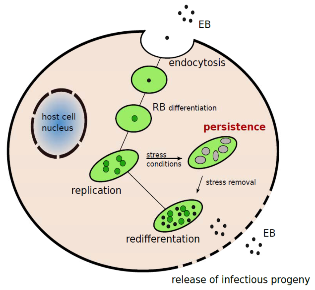 Schematic representation of C. pneumoniae developmental cycle. Infectious but metabolically inactive EB enters the host-cell membrane via endocytosis; EB transforms in the replicative and metabolically active RB; RB redifferentiates into EB, which is released by the host-cell via lysis. In the presence of IFN-γ, penicillin G, or other stressful conditions, intracellular C. pneumoniae generates a non-infectious persistent form.