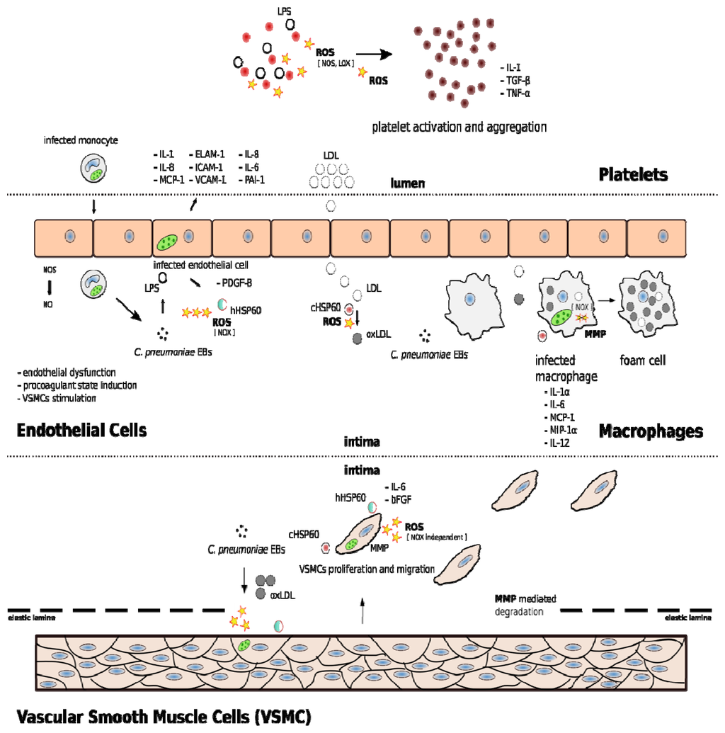 Noticeably, C. pneumoniae infection induces also oxidative stress in endothelial cells and VSMCs, promoting endothelial dysfunction and cell migration and proliferation respectively.