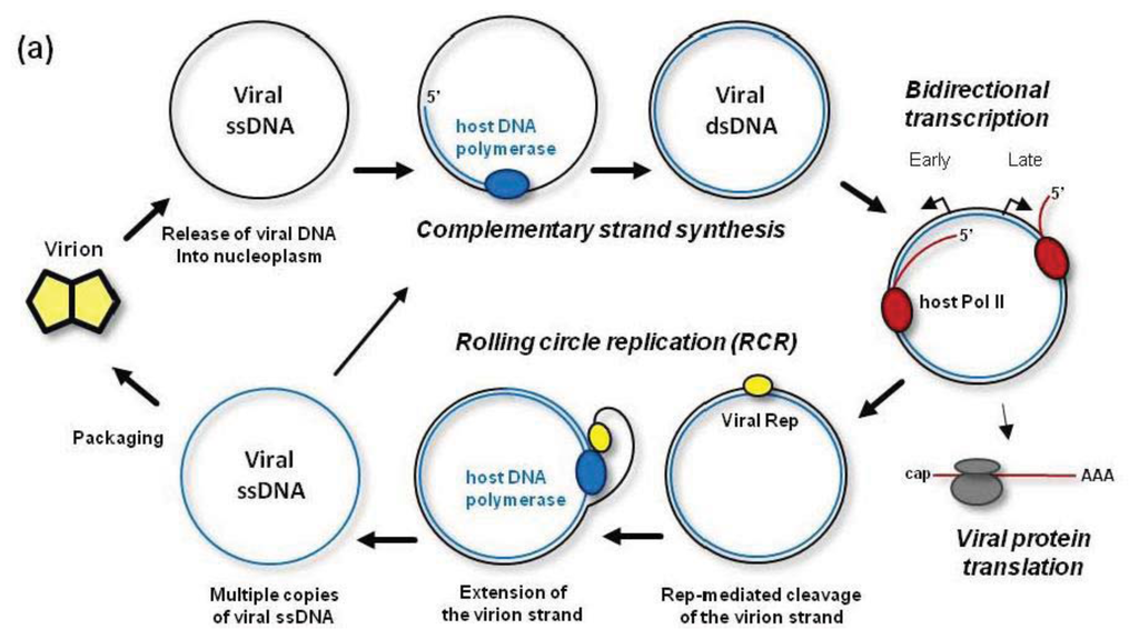 Figure 2), following insect injection into a plant cell, the viral particle is targeted via a coat protein-based nuclear localization signal to the nucleus, where viral ssDNA is released into nucleoplasm. The circular ssDNA is then converted to circular dsDNA by the host DNA polymerase and other components of the DNA repair machinery. In genus