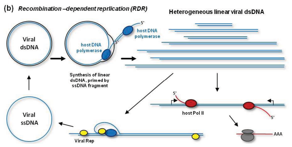 In addition to RCR, geminiviruses can replicate their dsDNA by a recombination-dependent replication (RDR) mechanism [