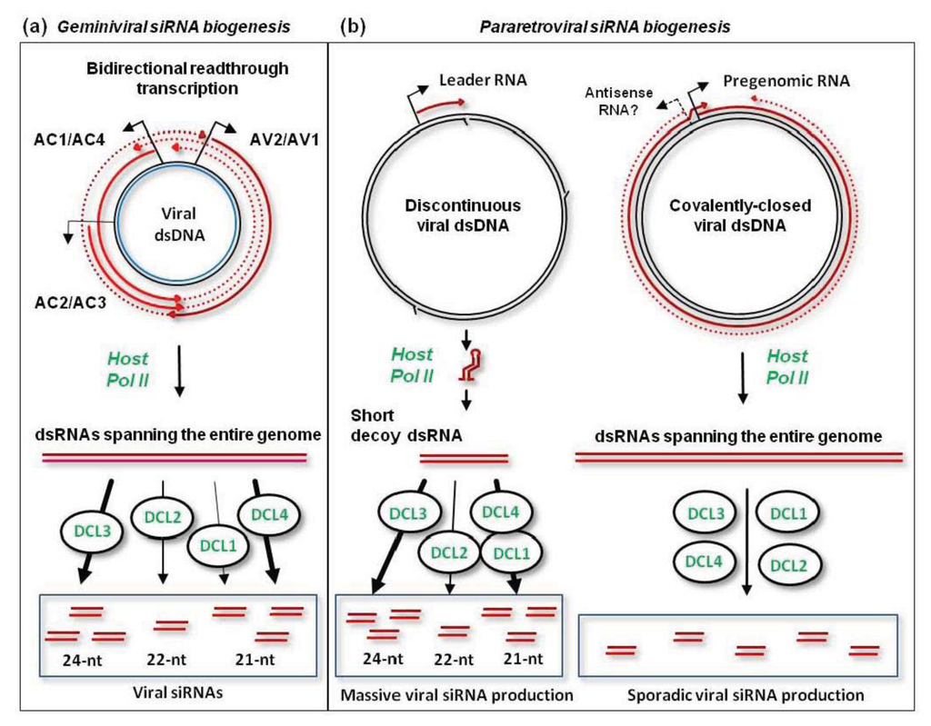 78]). Such readthrough transcripts of sense and antisense polarities can potentially form dsRNA substrates for DCLs. Interestingly, the intergenic region harboring bidirectional promoter elements between the transcription start sites is a poor source of viral siRNAs [