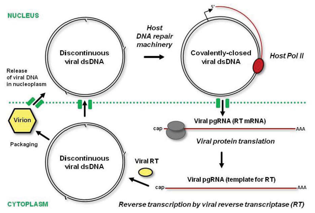 85]. These gaps are sealed in the nucleus by the host DNA repair machinery and the resulting covalently-closed circular dsDNA gets associated with nucleosomes to form a viral minichromosome, the template for Pol II transcription (