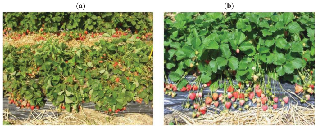 (a) Dora and (b) Record plants during fructification in fumigated soil (IPM). Dora is showing the first stress symptoms not evident in the Record plants.