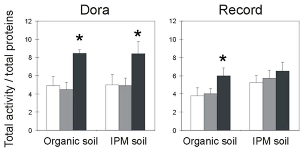 The Dora plants showed a higher RIP activity during fructification than during the quiescence and flowering periods, independent of the soil treatment; this result could be related to the plant stress that is associated with fruit production, which is the most intense phase of the plant life cycle. Record plants showed an increase in RIP activity during the fructification period that was significant only when the plants were grown in organic soil. These results support the hypothesis that the RIP level increases under stress conditions [16] and/or during plant senescence [13]. The more resistant Record cultivar was exposed to lower stress and exhibited an insignificant increase in RIP activity when grown under IPM, most likely due to the low level of pathogens in this soil.