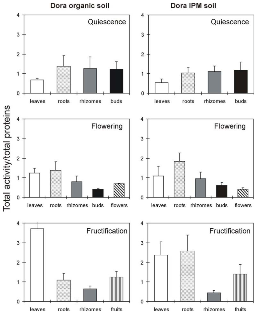 On the basis of the results for the Dora cultivar, the most important variations in RIP activity are as follows: (i) a strong increase in leaves during fructification both in organic conditions and under IPM, (ii) a high reduction in rhizomes during fructification under IPM (from 26% to 7%), and (iii) an increase in roots under IPM in flowering and in fructification.