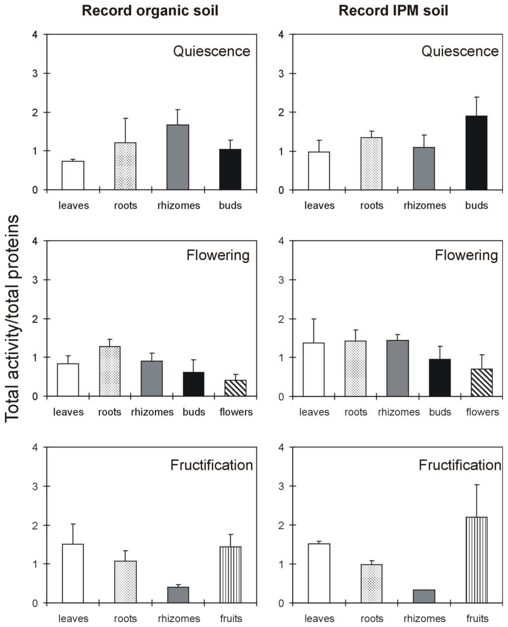 Record, the more pathogen resistant cultivar, showed a different distribution of RIP activity compared to Dora, both with regard to the two cultivation conditions (organic or fumigated) and the three growth stages (Figure 4). During quiescence, the activity was mainly distributed in the storage tissues (rhizomes and roots) in the plants grown in organic soil, whereas a higher activity was present in the buds in plants grown under IPM. For plants grown in organic soil, the RIP activity remained constant in the roots during flowering and fructification, with significant decreases in the rhizomes both during flowering (p = 0.029) and fructification (p = 0.002). No significant enhancement was observed in the leaves during the flowering period, though a significant increase was detected during fructification (p = 0.041).