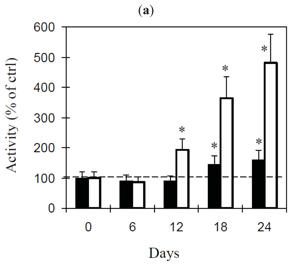 We also investigated the variations in Dora and Record RIP activity under drought stress conditions (Figure 5). In both varieties, the first signs of stress appeared in the leaves under drought conditions at 12 days after the water supply was discontinued, with the plants presenting the wilting of young leaves. The effects of stress continued at 18 days, a time when the young and mid-aged leaves were wilted and continued up to 24 days when all the leaves were wilted. All the plants died after 27–30 days. Despite this apparently similar fate in both Dora and Record, some important differences appeared when the RIP activity was analyzed. In the leaves of Dora, a slight increase in RIP activity was observed, starting from 18 days, with values approximately 1.5-fold higher than the control. In Record, an earlier and higher increase in RIP activity was observed, with values of approximately 2-fold after 12 days and approximately 5-fold after 24 days with respect to the control plants (Figure 5a).