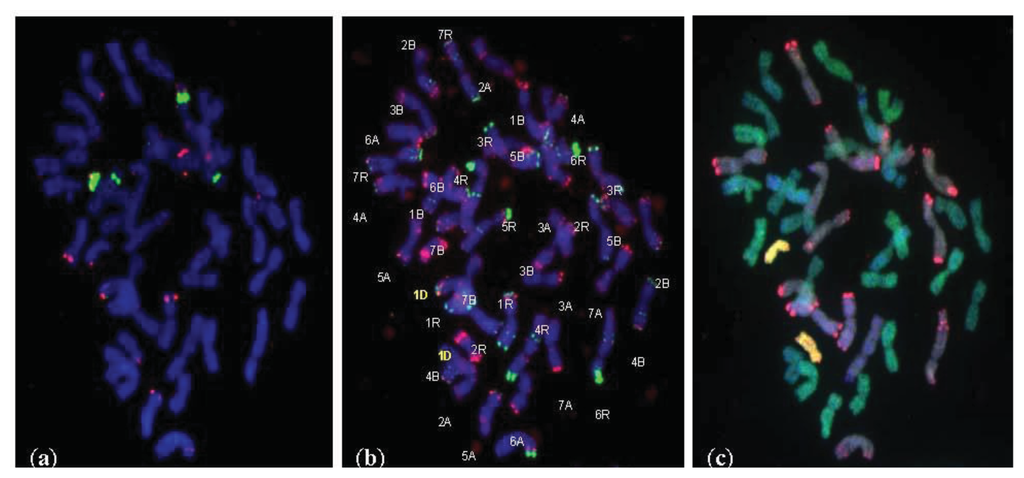 Fluorescence/genomic in situ hybridization (FISH/GISH) was successfully used to detect the D-genome chromosomes in given hybrids. The root-tip chromosome preparations were made according to Pijnacker and Ferwerda [49]. The probes and the competitor DNA were generated from total genomic DNA of Aegilops tauschii, Ae. speltoides, T. monococcum, and triticale cv. Secundo. Genomic in situ hybridization (GISH) was used as a screening method to detect the alien (D genome) chromatin and chromosome rearrangements among different genomes. Total Aegilops tauschii genomic DNA was used as a probe; it was labeled by nicktranslation with digoxigenin-11-dUTP for the screening, or digoxigenin-11-dUTP and tetramethyl-rhodamine-5-dUTP (Roche) (1:1 ratio) for the identification process. Fluorescein isothiocyanate conjugated (FITC) anti-digoxigenin antibodies (Roche) were used for the immunodetection of the digoxigenated probes. The total Triticum monococcum genomic DNA probe (digoxigenin-11-dUTP) and the total Secale cereale genomic DNA probe (tetramethyl-rhodamine-5-dUTP) were used to categorize the “A” and “R” subgenomes, respectively. Unlabeled DNA from triticale cv. Secundo (AABBRR) and Aegilops speltoides (BB) were sheared by autoclaving and used as blocking DNA for the screening/identifying GISH. Fluorescence in situ hybridization (FISH) was carried out to identify chromosome sets using the ribosomal DNA probes 5S rDNA (pTa794, labeled with tetramethyl-rhodamine-5-dUTP) and 35S rDNA (digoxigenin-11-dUTP), and the repetitive DNA probes pSc119.2 (digoxigenin-11-dUTP) and pAs1 (tetramethyl-rhodamine-5-dUTP). The preparations were mounted and counterstained in Vectashield containing 4′,6-diamidino-2-phenylindole (DAPI) or propidium iodide. The GISH/FISH images were acquired using an Olympus XM10 CCD camera with an Olympus BX 61 epifluorescence microscope and processed using Cell-F imaging software (version 3.1; Olympus Soft Imaging Solutions GmbH: Münster, Germany) and Micrografx Picture Publisher software (version 8.1; Micrografx Inc.: Richardson, TX, USA).