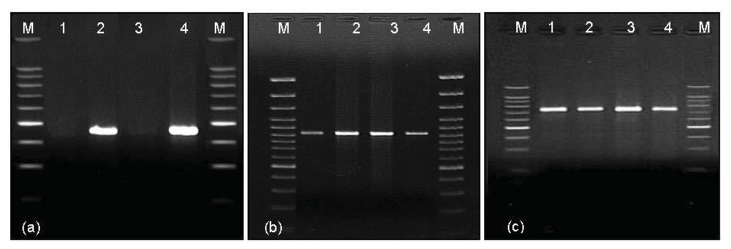Dominant PCR markers for triticale HMW glutenin subunits (a) Dx5/Dx2; (b) AxNull; and (c) By20*. Primer set GS I produces a 450 bp fragment in triticale lines that have the Glu-D1d (Dx5) allele. The PCR product for the Glu-A1c (AxNull) allele is 920 bp and that for the By20* subunit is 750 bp. Lanes, M, 100-bp DNA Ladder Plus (Promega); 1, Glu-Sec group; 2, Glu-Sec + Tm; 3, Glu-Sec + 1D; 4, Glu-Sec + Tm + 1D group.