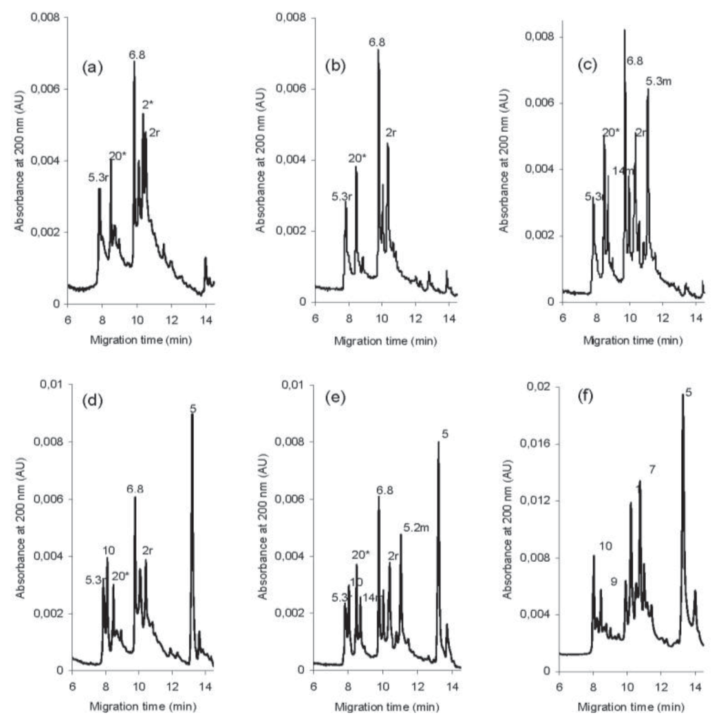 CZE electrophorograms of nonalkylated HMW proteins from four distinct introgressive Triticale/Triticum monococcum groups with various HMW-GS and HMW-SS compositions and reference triticale and wheat cultivars. (a) standard triticale (cv. Lasko; 2*/6.8 + 20*/2r + 5.3r); (b) Glu + Sec (N/6.8 + 20*/2r + 5.3r); (c) Glu + Sec + Tm (N/6.8 + 20*/2r + 5.3r; 5.2 m + 14 m); (d) Glu + Sec + 1D (N/6.8 + 20*/2r + 5.3r; 5 + 10); (e) Glu + Sec + Tm + 1D (N/6.8 + 20*/2r + 5.3r; 5.2 m + 14 m; 5 + 10); (f) Standard wheat (cv. Panda) (1/7 + 9/5 + 10). The HMW-SS and HMW-Tm peaks are additionally indicated by the letter “r” and “m”, respectively, at the end of sing. The proteins were separated at 10 kV and 40 °C with a 75 mM iminodiacetic acid (IDA), 0.15% poly(ethylene oxide) (PEO) with a molecular weight of 8,000,000, 0.05% 26 mM SB3-12, and 20% (v/v) acetonitrile.