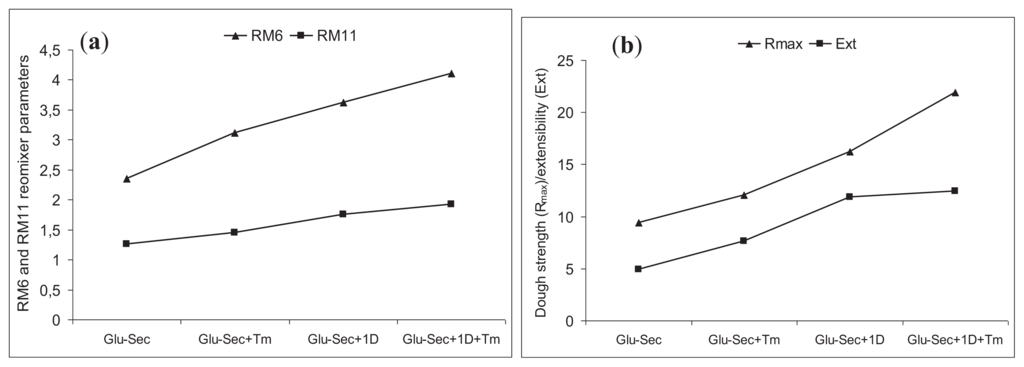 A reomixer, a mixer similar to the typical mixograph, is used in cereal research to measure a range of rheological parameters that relate to the behavior of dough during bread making. In general, strong doughs have long mixing times (RM6), high peak heights (RM8), and wide bandwidths at 10 min (RM11) [41]. The reomixer properties of two generations of triticales from consecutive years of cultivation are presented in Table 4. (These generations represent vegetative seasons with different climatic conditions; the first year was typically dry, whereas the second was wet.) The reomixer analysis showed that the introgressive triticale lines had significantly (p < 0.05) higher values for five major reomixer parameters (IHTP, RM4, RM6, RM8, and RM11) than the triticale lines. For example, the mean values of the peak time (RM6) and area under the line (IHTP) for the F7 and F8 generations of the Triticale/T. monococcum lines with the 1D/1A chromosome substitution increased by 1.7-fold and 3.0-fold, respectively, in comparison with the secondary triticale lines. These dough-mixing parameters are similar to those of flour from weak wheat cultivars (data not shown). The considerable increase in these parameters results from an increase in the amount of polymeric proteins in these lines. The reomixer curve values of the three different triticale groups are shown in order, Glu + Sec + D1 + Tm > Glu-Sec + D1 > Glu-Sec + Tm. The reomixer data support the positive effect of T. monococcum gluten proteins on dough mixing. The presence of the Glu-D1 locus encoding the Dx5 + Dy10 subunits in the Triticum/T. monococcum lines additionally improved the mixing properties and dough functionality.