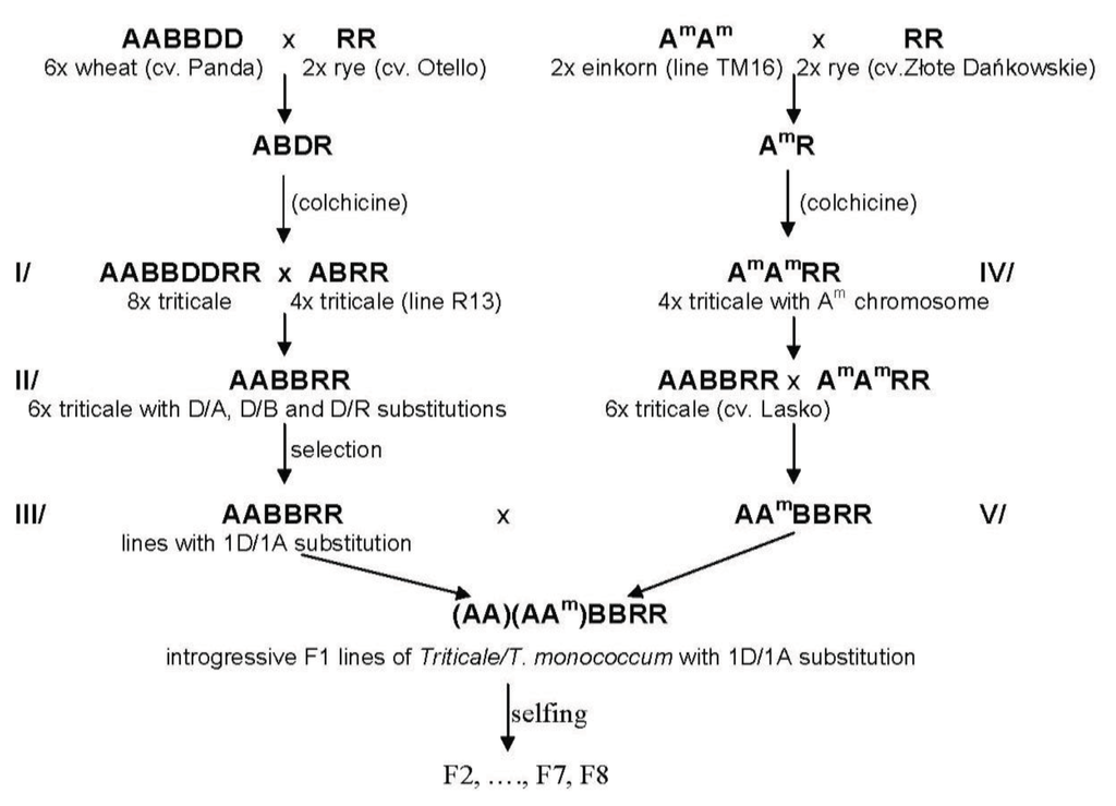 Crossing scheme to introduce wheat 1D and einkorn Am chromosomes into hexaploid triticale.