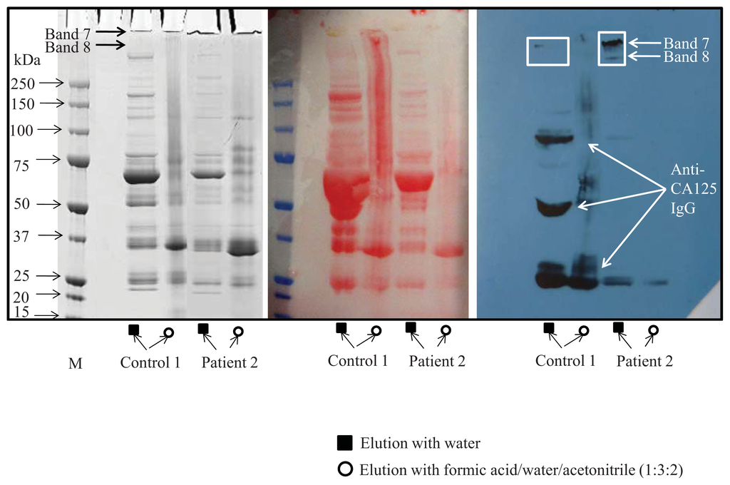 The isolation of CA125 by immunoadsorption was optimized according to Peter et al. [17]. Elution with water as well as formic acid/water/acetonitrile (1:3:2) was tested. The presence of CA125 was identified by Western blot in the water eluate in bands 7 and 8 (Figure 2). Amount of CA125 isolated was analysed by CA125 ELISA. CA125 from all patients and age-matched controls was isolated using this method and bands 7 and 8 were cut from the SDS-PAGE gel and used for glycan analysis.