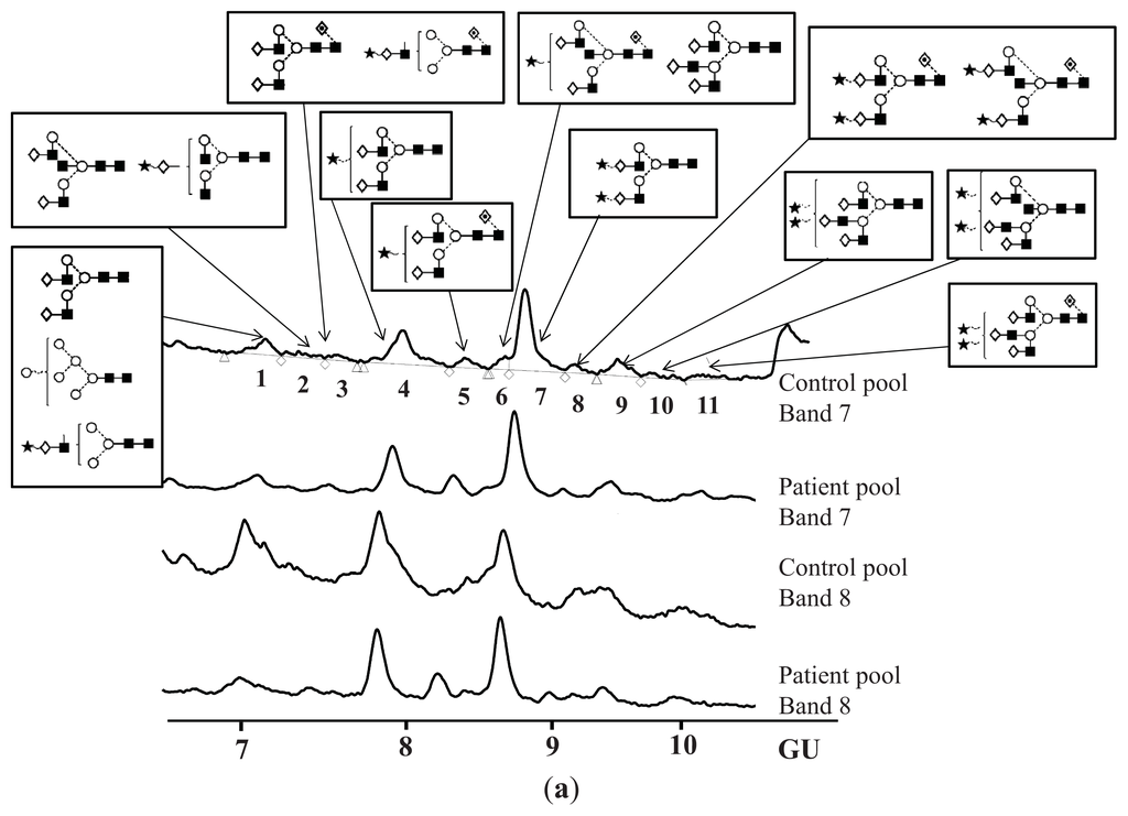 The differences between pooled controls and patients are shown in Table 2. Core-fucosylated bi-antennary monosialylated glycans were increased and mostly bisecting bi-antennary and non-fucosylated glycans were decreased in patients compared to controls.