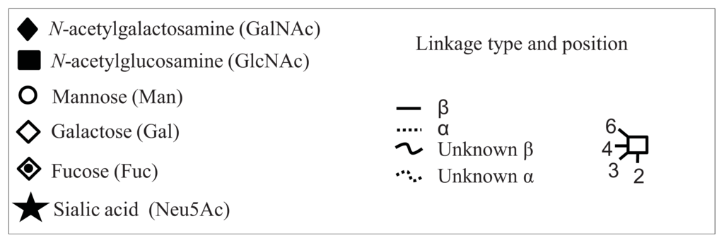 - Harvey, D.J.; Merry, A.H.; Royle, L.; Campbell, M.P.; Dwek, R.A.; Rudd, P.M. Proposal for a standard system for drawing structural diagrams of N- and O-linked carbohydrates and related compounds. Proteomics 2009, 9, 3796–3801. [Google Scholar]