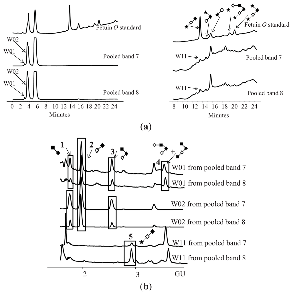 - Royle, L.; Radcliffe, C.M.; Dwek, R.A.; Rudd, P.M. Detailed structural analysis of N-glycans released from glycoproteins in SDS-PAGE gel bands using HPLC combined with exoglycosidase array digestions. Methods Mol. Biol 2006, 347, 125–143. [Google Scholar]