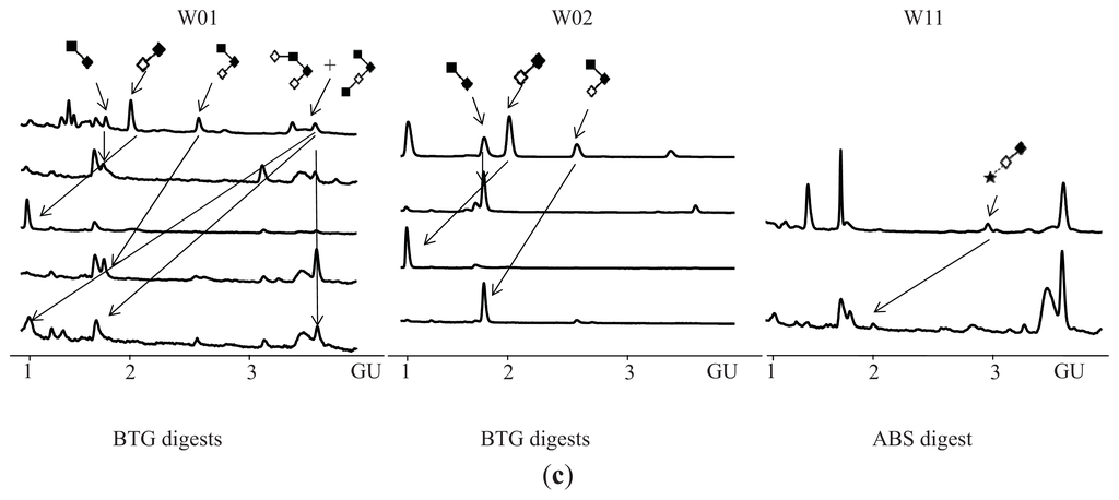 All enzymes were purchased from Prozyme, San Leandro, CA, USA. The 2AB-labelled glycans were digested in a volume of 10 μL for 18 h at 37 °C in 50 mM sodium acetate buffer, pH 5.5, using arrays of the following enzymes: ABS—Arthrobacter ureafaciens sialidase (EC 3.2.1.18), NAN1—Streptococcus pneumoniae sialidase (EC 3.2.1.18), 1 U/mL; BTG—bovine testes β-galactosidase (EC 3.2.1.23), 1 U/mL; BKF—bovine kidney alpha-fucosidase (EC 3.2.1.51), 1 U/mL; GUH—β-N-acetylglucosaminidase cloned from Streptococcus pneumonia, expressed in E. coli (EC 3.2.1.30), 4 U/mL.