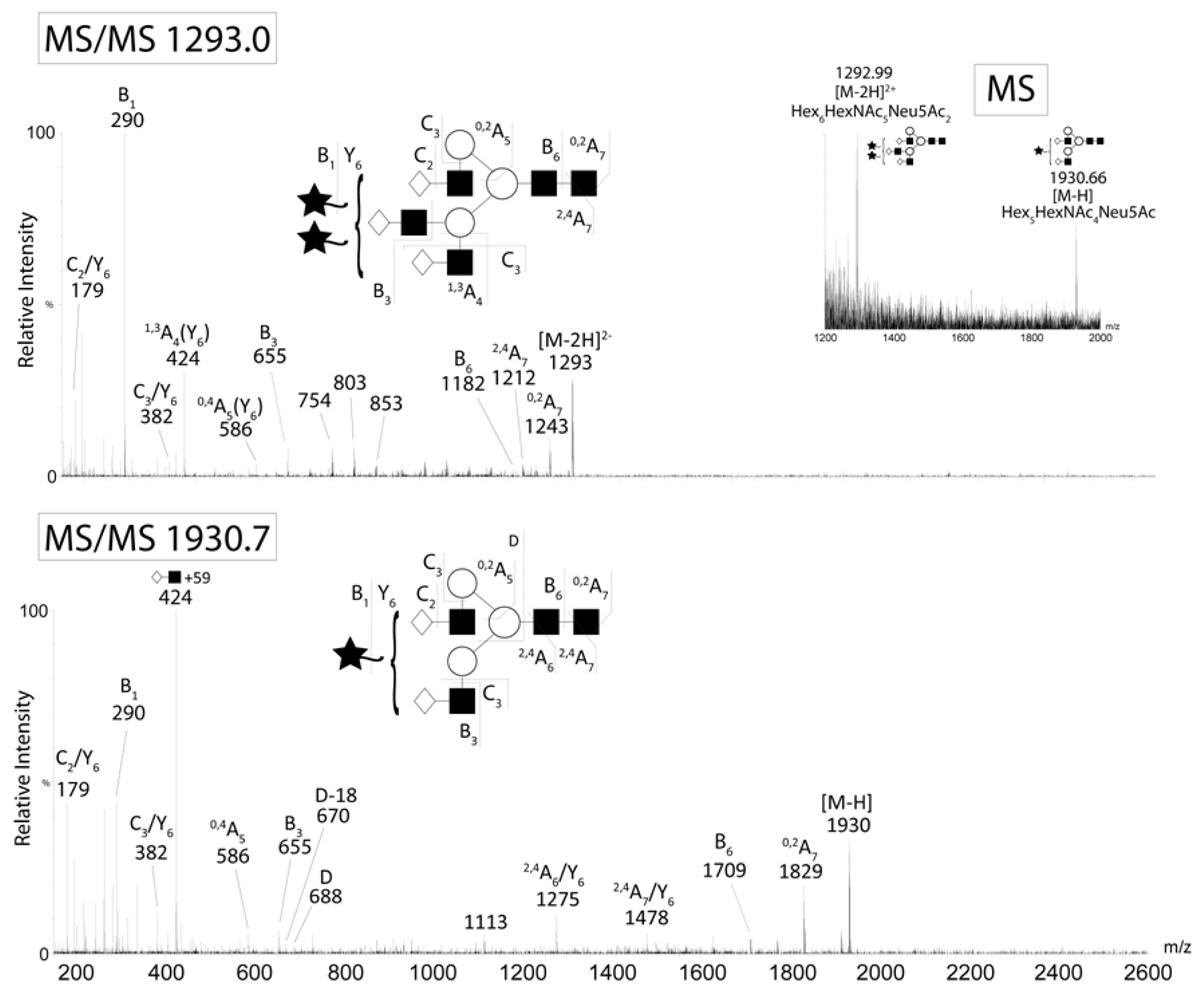 - Harvey, D.J. Fragmentation of negative ions from carbohydrates: Part 3. Fragmentation of hybrid and complex N-linked glycans. J. Am. Soc. Mass Spectrom 2005, 16, 647–659. [Google Scholar]