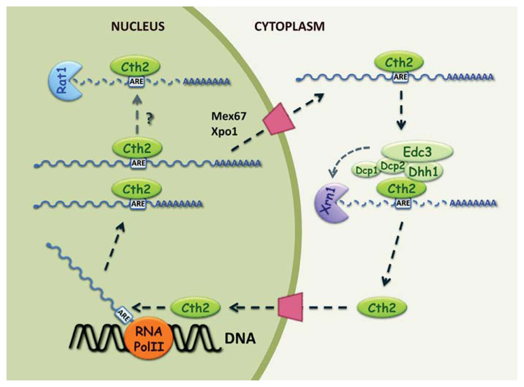 Model for the post-transcriptional regulation of adenosine/uridine-rich element (ARE)-containing transcripts by Cth2 in response to Fe deficiency. This model proposes the following steps for the degradation of the SDH4 mRNA by Cth2 protein: (1) Docking and recognition: Cth2 co-transcriptionally binds to AREs in the nascent mRNA before polyadenylation occurs; (2) 3′ end processing: Cth2-binding to the AREs partially interferes with normal polyadenylation, leading to the synthesis of extended transcripts, which are preferentially degraded in a Cth2-dependent manner by a 5′ to 3′ exoribonuclease, either Rat1 in the nucleus or Xrn1 after transport to the cytoplasm; (3) Export: Cth2 bound to the transcript is translocated to the cytoplasm via mRNA export pathways that require Mex67 and Xpo1/Crm1; (4) Cytoplasmic degradation: Cth2 interacts with the RNA helicase Dhh1, which recruits the decapping enzymes and Xrn1 to the target mRNA that is degraded from 5′ to 3′; (5) Recycling and nuclear import: After mRNA degradation, Cth2 is released from the decay machinery and can potentially re-enter the nucleus to initiate a new cycle of ARE-mediated decay (AMD).