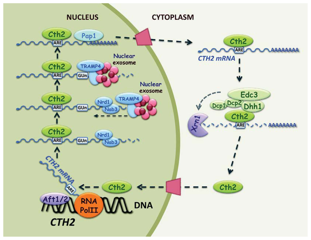 Model representing the post-transcriptional mechanisms regulating the CTH2 mRNA expression. CTH2 mRNA maturation starts with a 3′ extended transcript that is recognized by the Nrd1-Nab3 complex, and is subsequently processed by the nuclear exosome and the TRAMP4 polyadenylation complex. Eventually, the exosome pauses at a (GU3–5)5 site and Pap1 polyadenylates the trimmed CTH2 transcript. Moreover, CTH2 mRNA contains an ARE in its 3′ UTR which allows the binding of the Cth2 protein and auto-degradation. The auto-destabilization mechanism can be similar to other ARE-containing mRNAs and depends on the cytoplasmic 5′ to 3′ mRNA degradation machinery. Although not represented, Rat1 has also been implicated in the CTH2 transcript turnover.