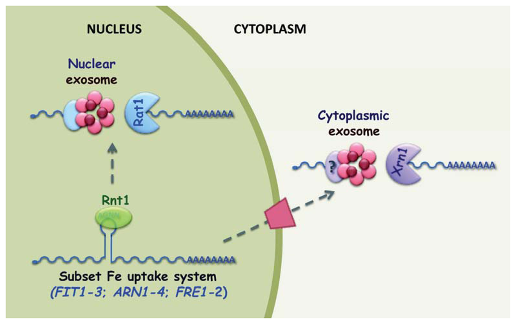Upon Fe excess, S. cerevisiae RNase III endonuclease Rnt1 limits the expression of a subset of genes from the Fe uptake system to prevent Fe toxicity. Rnt1 specifically binds to the stem-loop structures present in some mRNAs from the Fe regulon. The nuclear exosome, and the Rat1 and Xrn1 5′ to 3′ exonucleases, rapidly degrade Rnt1 cleavage products. Despite not being demonstrated, the cytoplasmic exosome has also been included in this model.